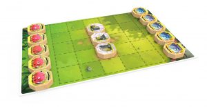- Pierre feuille ciseaux : Dans cette variante de jeu, le sens de votre pion n’influe pas sur le sens dans lequel il peut pousser un jeton ou un pion. A la place, le sens dans lequel vous posez vos pions va définir leur état. Vous pouvez les orienter vers la gauche ou vers la droite du plateau. Vous pouvez aussi utiliser un tour pour changer l’état de votre jeton. Pour réussir une poussée, les règles de base s’appliquent, mais seuls les pions dans le même état que vous gênent l’action. Un pion dans l’état opposé n’empêche pas le déplacement. Dans un cas d’oppositions entre plusieurs pions dans le même état, le plus grand nombre l’emporte. Un rocher compte comme une demi unité et a les deux états à la fois, il est donc impossible d’en pousser deux avec une seule unité.
